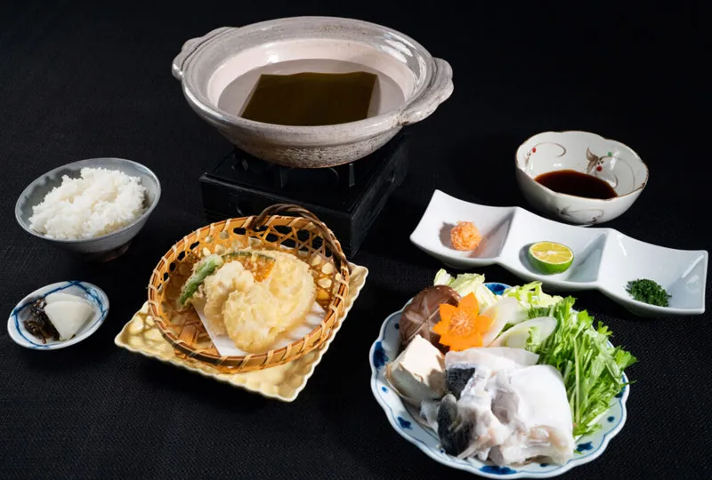 「淡路3年とらふぐ御膳」では、天ぷらや鍋料理を中心に気軽にふぐを楽しめます。弾むような身と濃い旨みを、素材の旨みを活かす職人の技で天ぷらとお鍋に仕立てています。