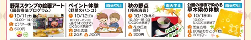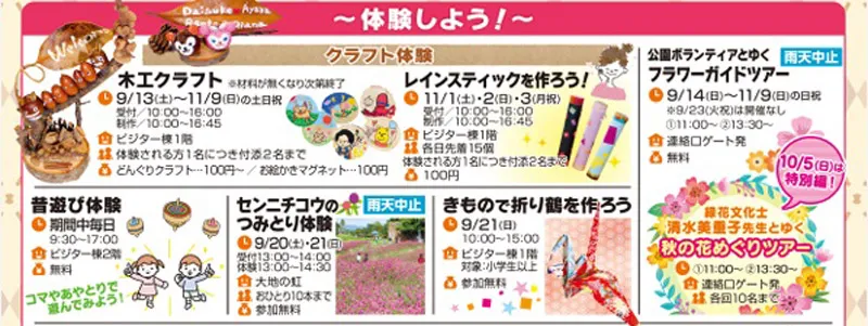 期間中の土日祝には、子供から大人まで楽しめる数多くのイベントが企画されます。花と緑にふれる体験、文化の秋・スポーツの秋の体験、手作り体験など秋を感じる企画が満載となります。