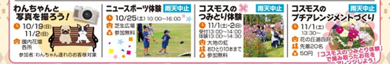 わんちゃんと写真を撮ろう、秋の野点、絵画アート、コスモスのつみとり体験、コスモスのミニブーケづくり、ニュースポーツ体験、ポン菓子のふるまい、ガーデンマルシェ、淡路食のふるまいなどがあります。