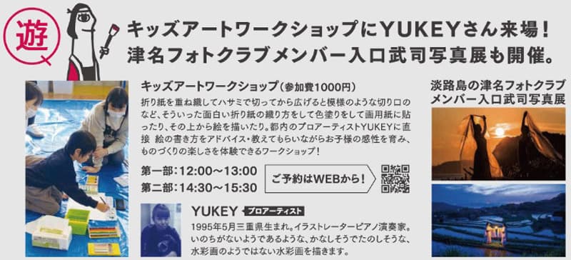 「遊」では、キッズアートワークショップが開催されます。アーティストの山口大介さんが来場します。みんなで大きなキャンバスに絵の具で好きなように塗り絵を描きます。参加料金は無料です。