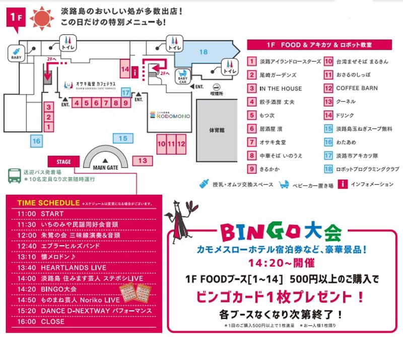 淡路島の美味しい処に、雑貨などのマルシェ、豪華景品が当たるビンゴなどのイベントも盛りだくさんです。恒例の淡路玉ねぎスープを無料で大盤振る舞いで、何杯でもおかわり大丈夫です。