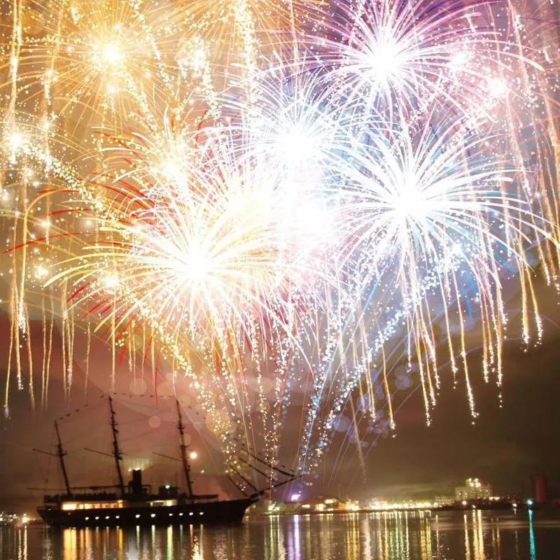 初日のスペシャルイベントとして福良花火大会が開催されます。通常は昼間にしか運航しない遊覧船「咸臨丸」で特別に夜間運航をしながら最も花火に近い場所から打ち上げ花火を堪能できます。
