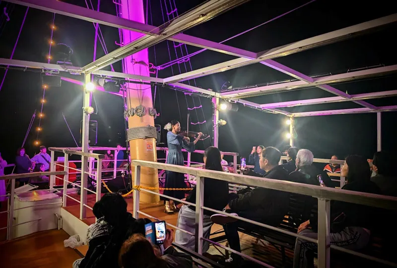 淡路島の夜空を彩る打ち上げ花火を目の前で楽しむことができます。特別に夜間に出港する遊覧船で、プロヴァイオリニストの船上生演奏・3年とらふぐのてっさ(刺身)振舞い・ウェルカムドリンクも堪能できます。