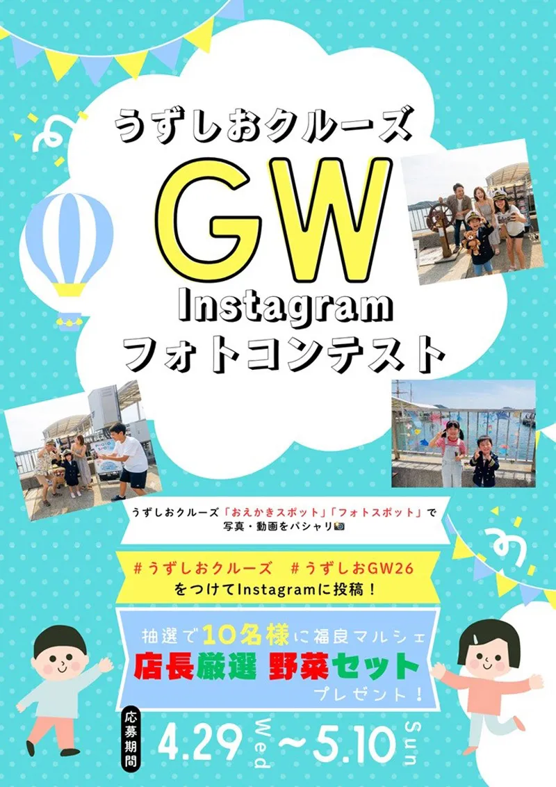 Instagramキャンペーンでは、指定のハッシュタグ(#うずしおクルーズ #うずしおGW26)を付けて写真を投稿します。抽選で10名様に「福良マルシェ店長厳選 旬の野菜セット」がプレゼントされます。