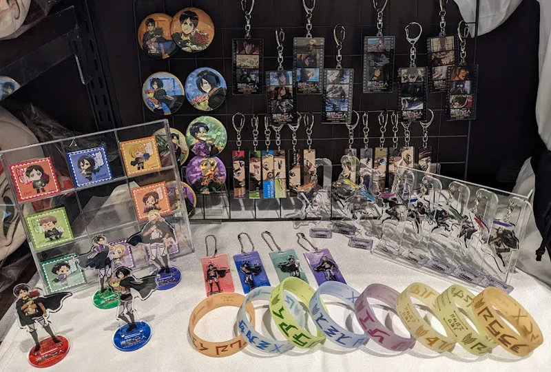 缶バッジやアクリルスタンドをはじめ、「リヴァイ兵士長のセリフメモ」や「アルミンの“一生かけても取りつくせないほどの”塩」のほか、巨人のアクリルスタンドやクランチチョコなどもあります。