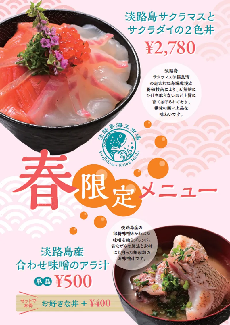 巨大な生け簀から瀬戸内の魚介を捌く新鮮な海鮮丼やバーベキューが人気の海王市場では「淡路島サクラマスと桜鯛の2食丼」と「淡路島産合わせ味噌のアラ汁」が登場します。