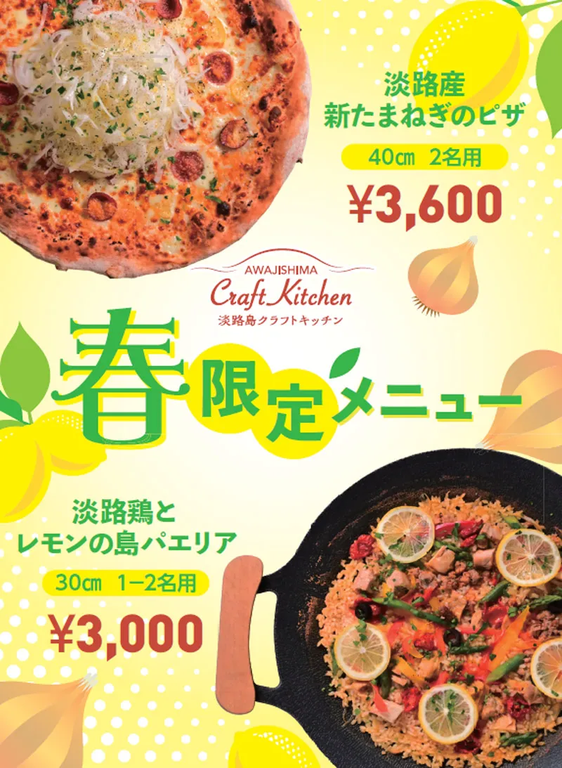 牛肉100%パティと玉ねぎの巨大ハンバーガーや直径30センチの名物ピザなどが人気のクラフトキッチンでは「淡路島新玉ねぎのピザ」と「淡路鶏とレモンの島パエリア」が登場します。